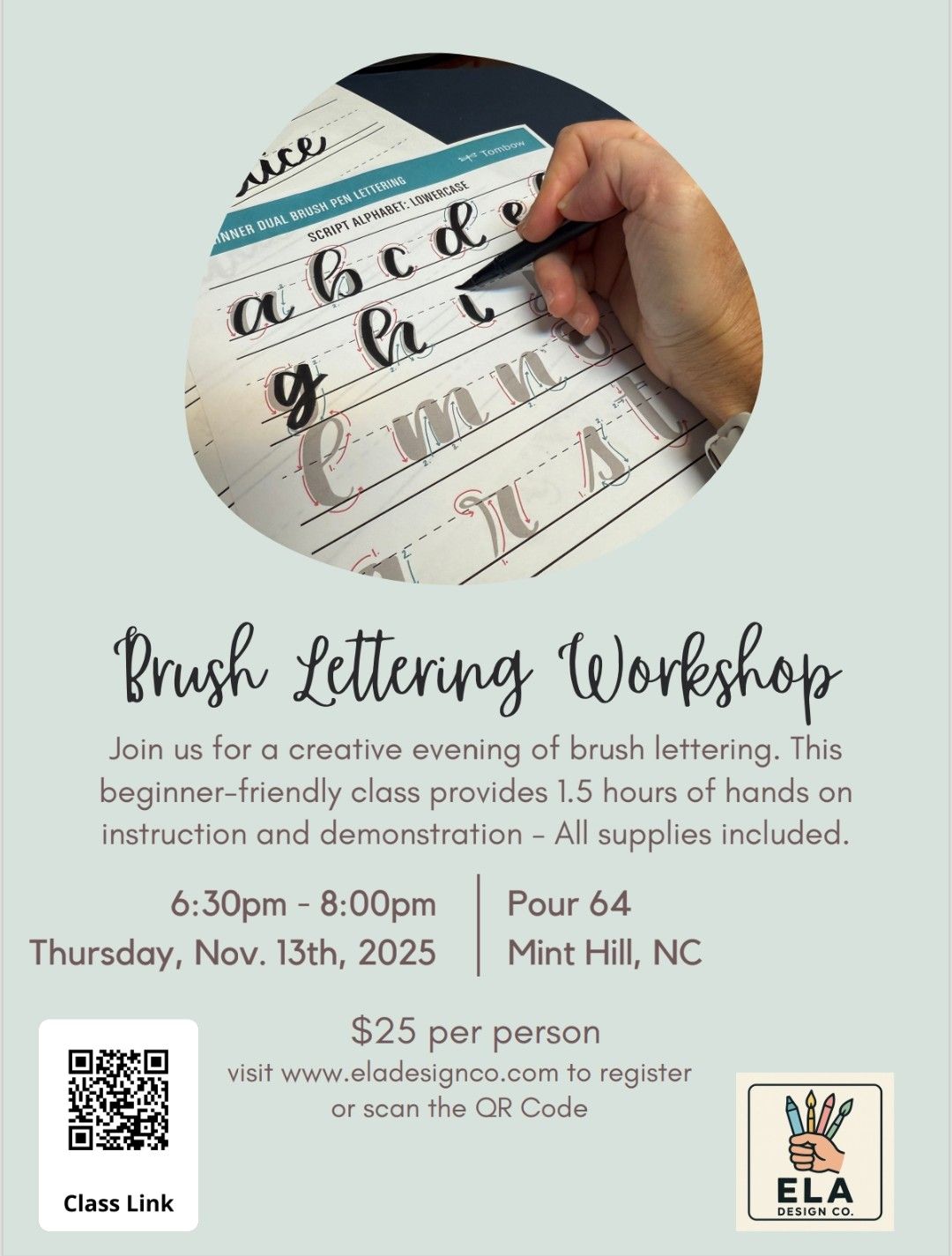 Join us Thursday, November 13th at Pour 64 for Beginner Brush Lettering.This class will teach you everything to get started and all supplies included. We’ll also work on creating some fun holiday placecards. Visit www.eladesignco.com to register.